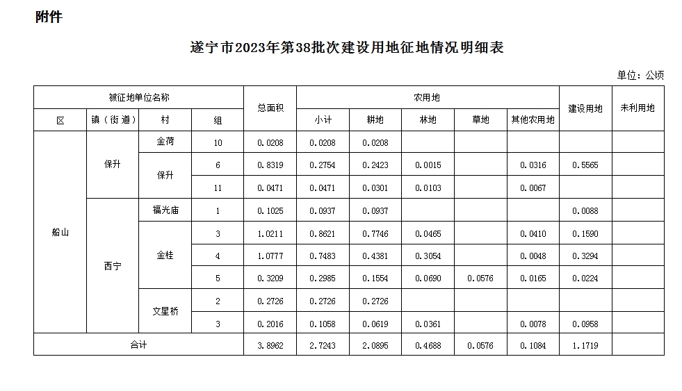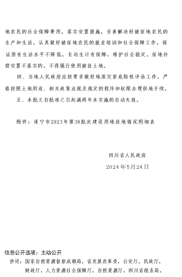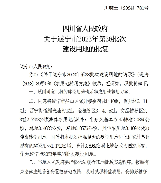 四川省人民政府关于遂宁市2023年第38批次建设用地的批复(川府土〔2024〕781号)