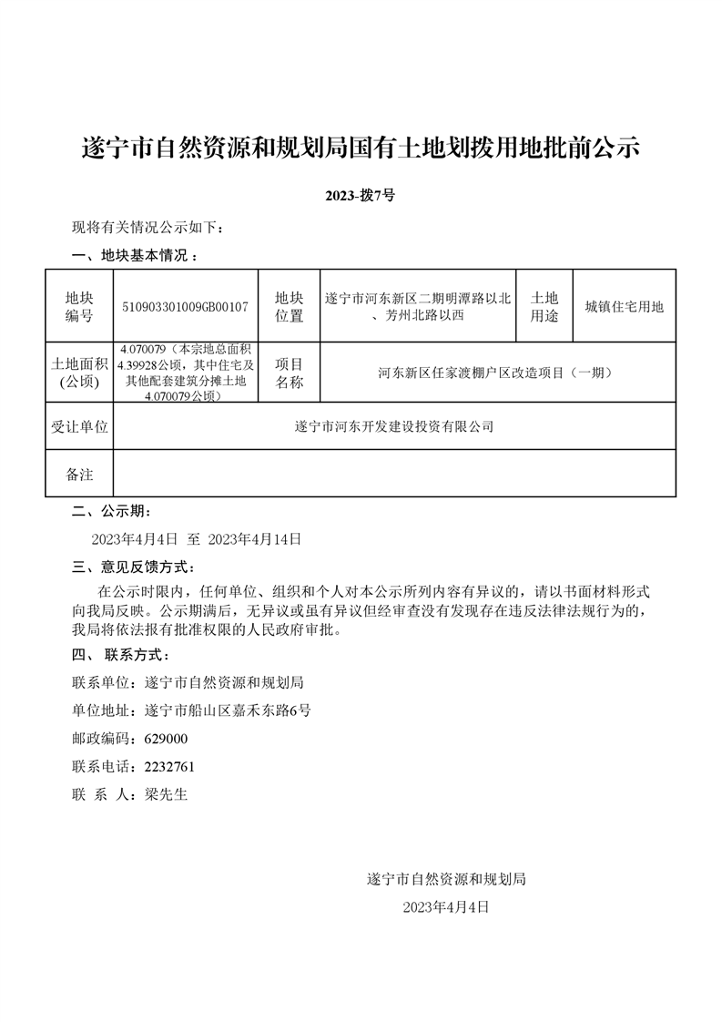 遂宁市自然资源和规划局国有土地划拨用地批前公示(2023-拨7号)