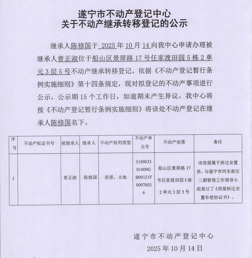遂宁市不动产登记中心关于不动产继承转移登记的公示(陈修国)