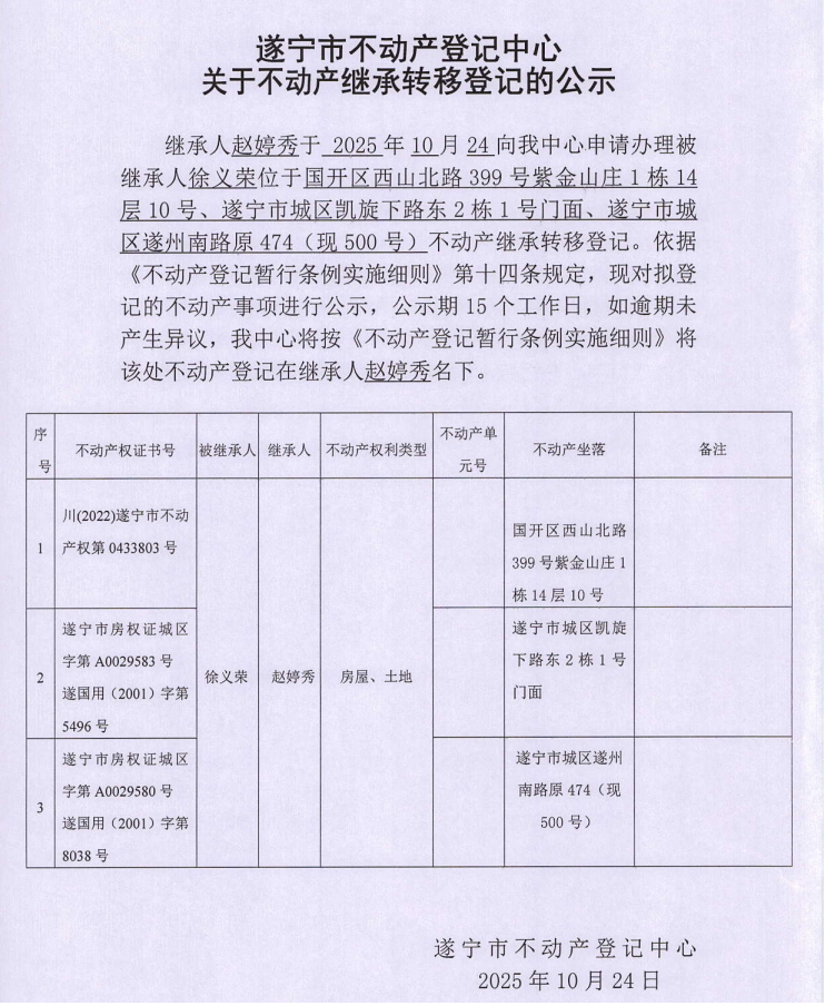 遂宁市不动产登记中心关于不动产继承转移登记的公示(赵婷秀)