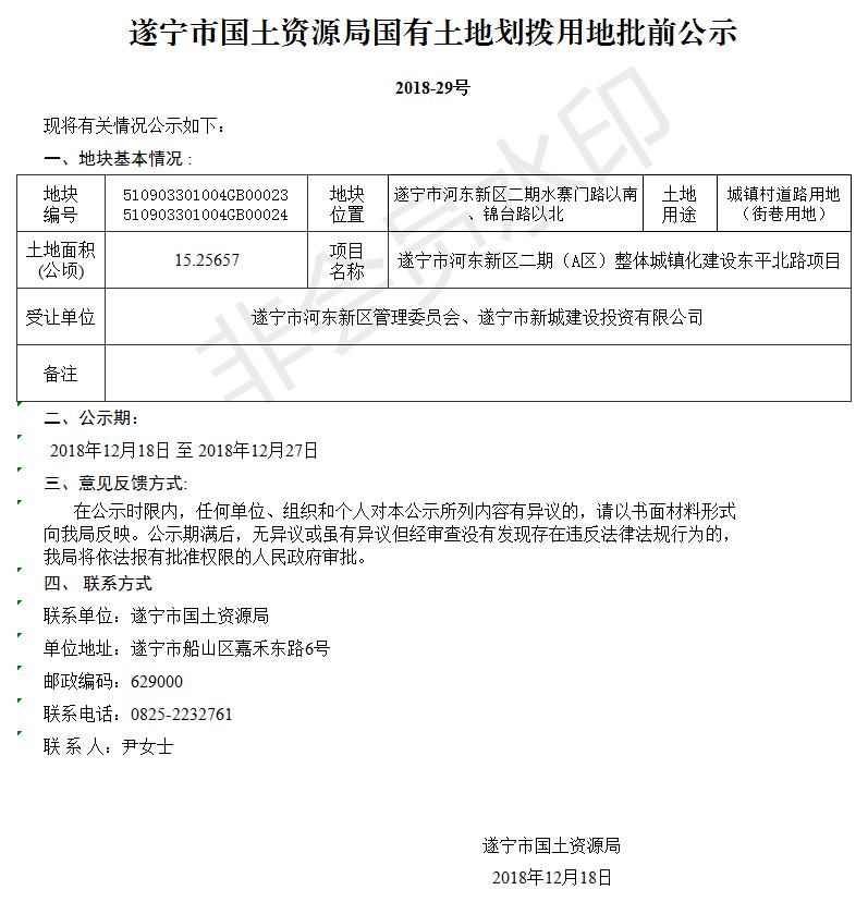 遂宁市国土资源局国有土地划拨用地批前公示(2018-29号)