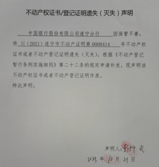 不动产权证书/登记证明遗失(灭失)声明(中国银行股份有限公司遂宁分行)