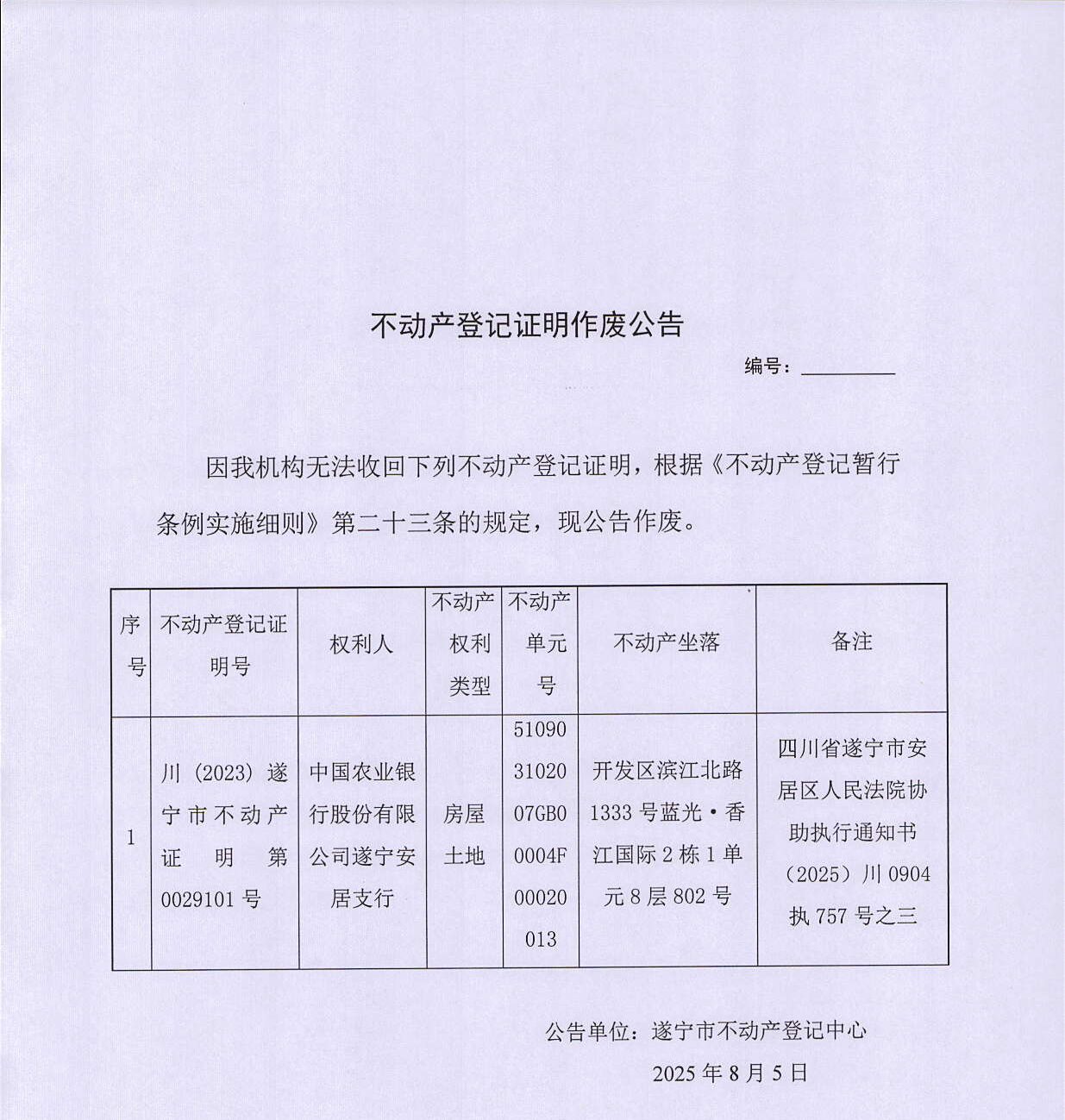 不动产登记证明作废公告(中国农业银行股份有限公司遂宁安居支行)