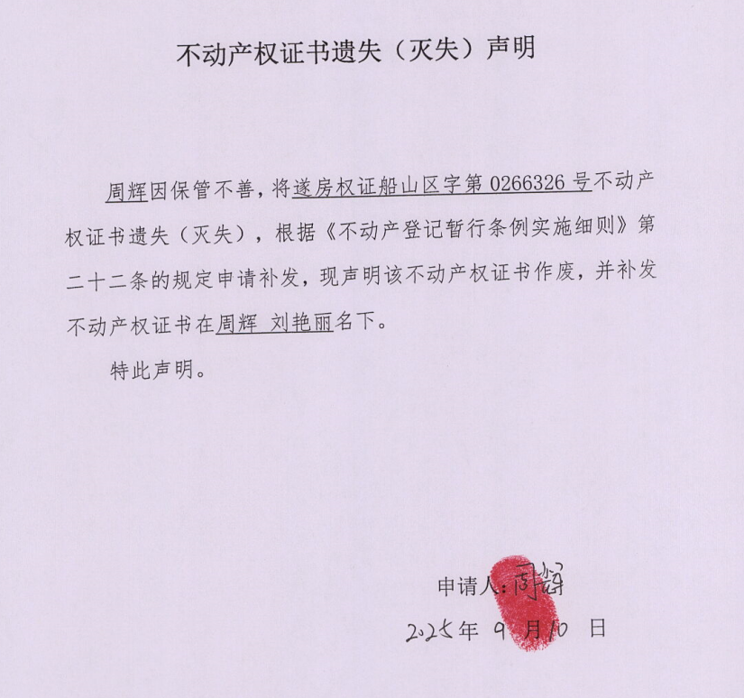 不动产权证书遗失(灭失)声明( 周辉、刘艳丽)