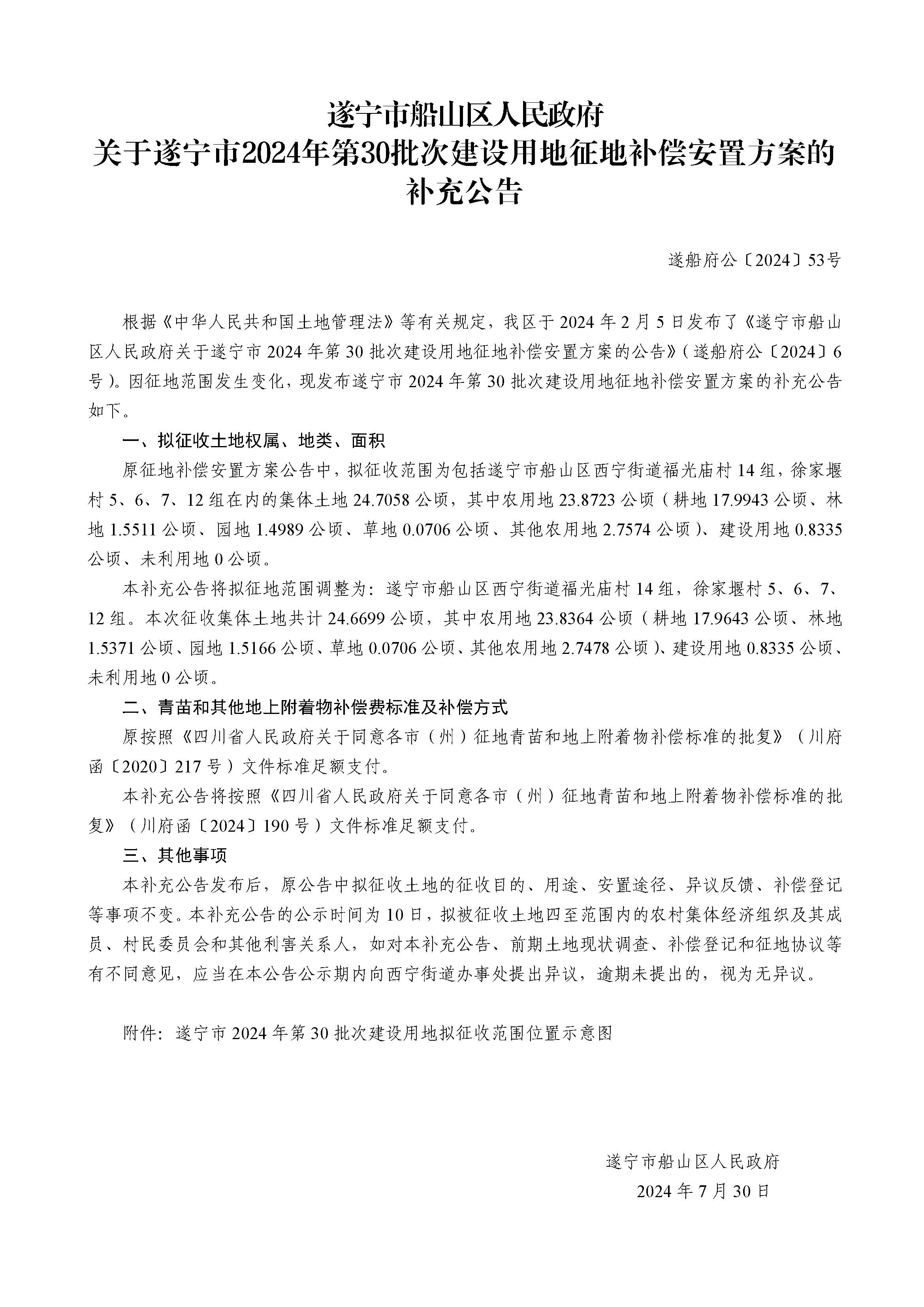 遂宁市船山区人民政府关于遂宁市2024年第30批次建设用地征地补偿安置方案的补充公告(遂船府公〔2024〕53号)