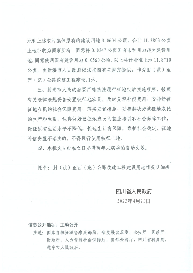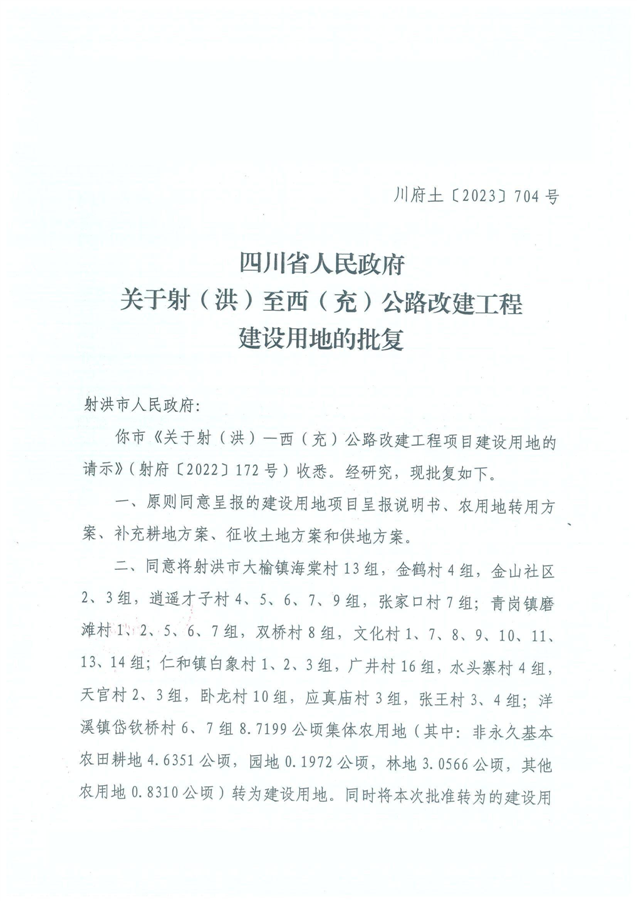 四川省人民政府关于射(洪)至西(充)公路改建工程建设用地的批复(川府土〔2023〕 704 号 )