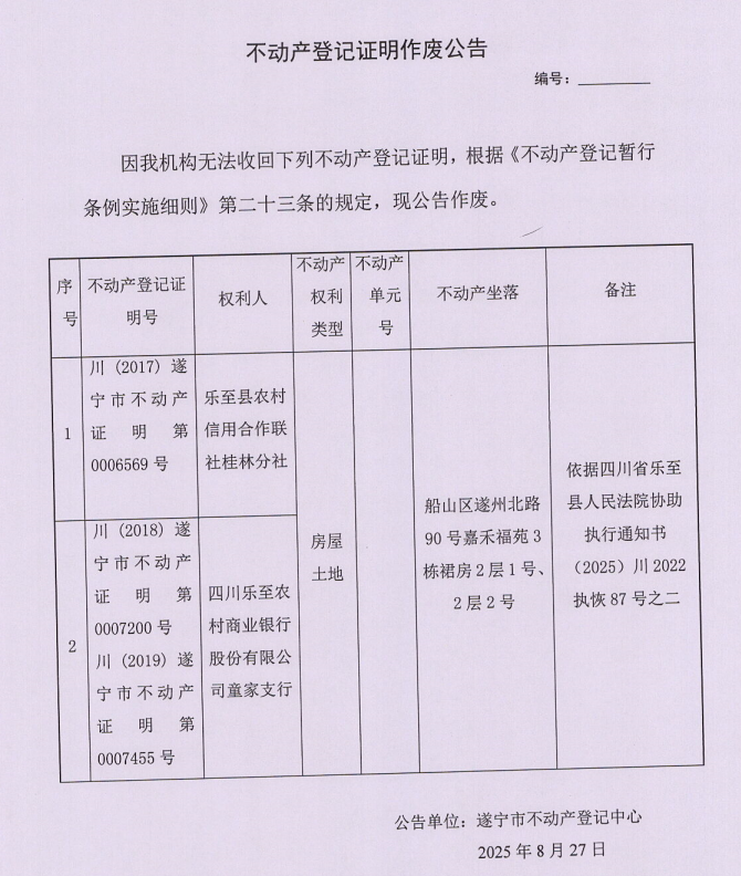 不动产登记证明作废公告(乐至县农村信用合作联社桂林分社、四川乐至农村商业银行股份有限公司童家支行)