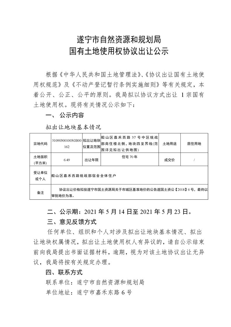 遂宁市自然资源和规划局国有土地使用权协议出让公示