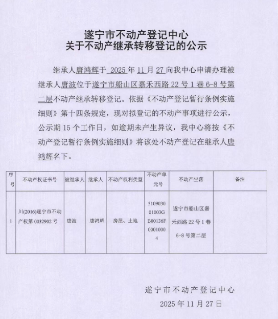 遂宁市不动产登记中心关于不动产继承转移登记的公示(唐鸿辉)