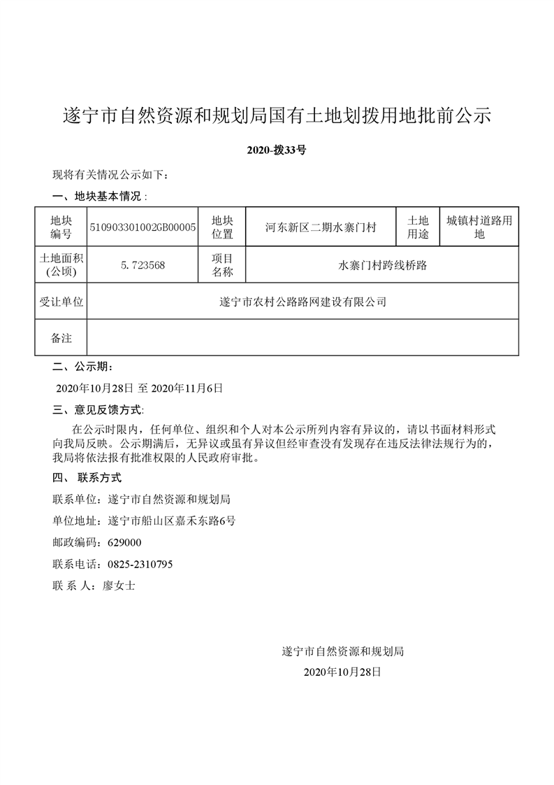 遂宁市自然资源和规划局国有土地划拨用地批前公示2020-拨33号