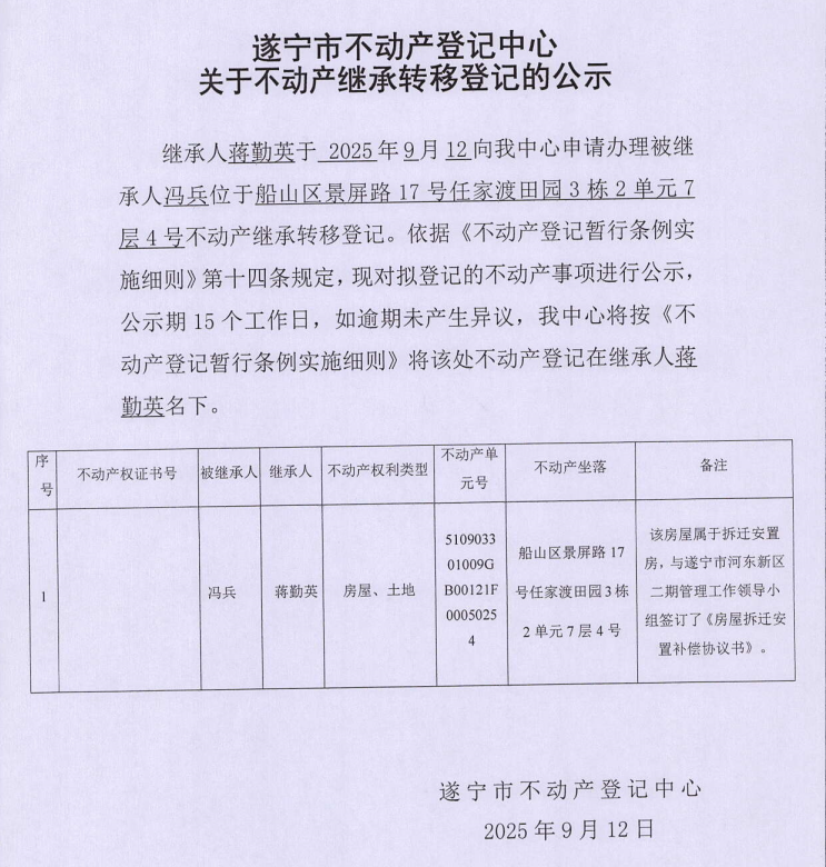 遂宁市不动产登记中心关于不动产继承转移登记的公示(蒋勤英)