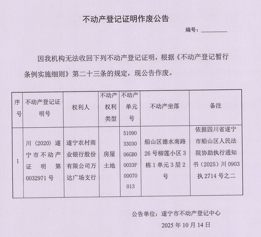 不动产登记证明作废公告(遂宁农村商业银行股份有限公司万达广场支行)