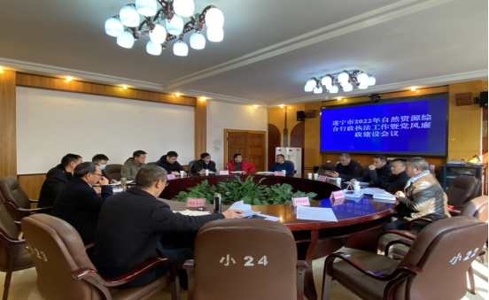 为加强队伍建设,谋划做好2022年全市自然资源综合行政执法工作,2月11日,市自然资源和规划局召开“遂宁市2022年自然资源综合行政执法工作暨党风廉政建设会议”,会议由副局长杨丹林主持,各县(市、区)局、市直园区分局分管领导及执法大队负责人参加会议。