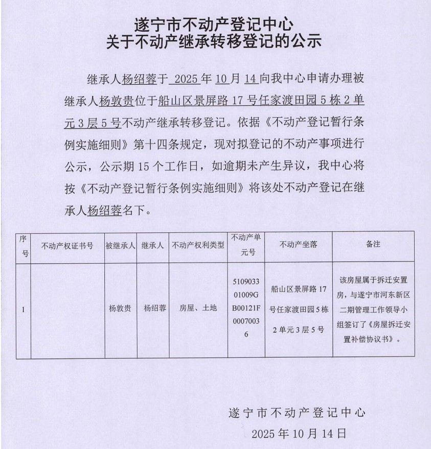 遂宁市不动产登记中心关于不动产继承转移登记的公示(杨绍蓉)