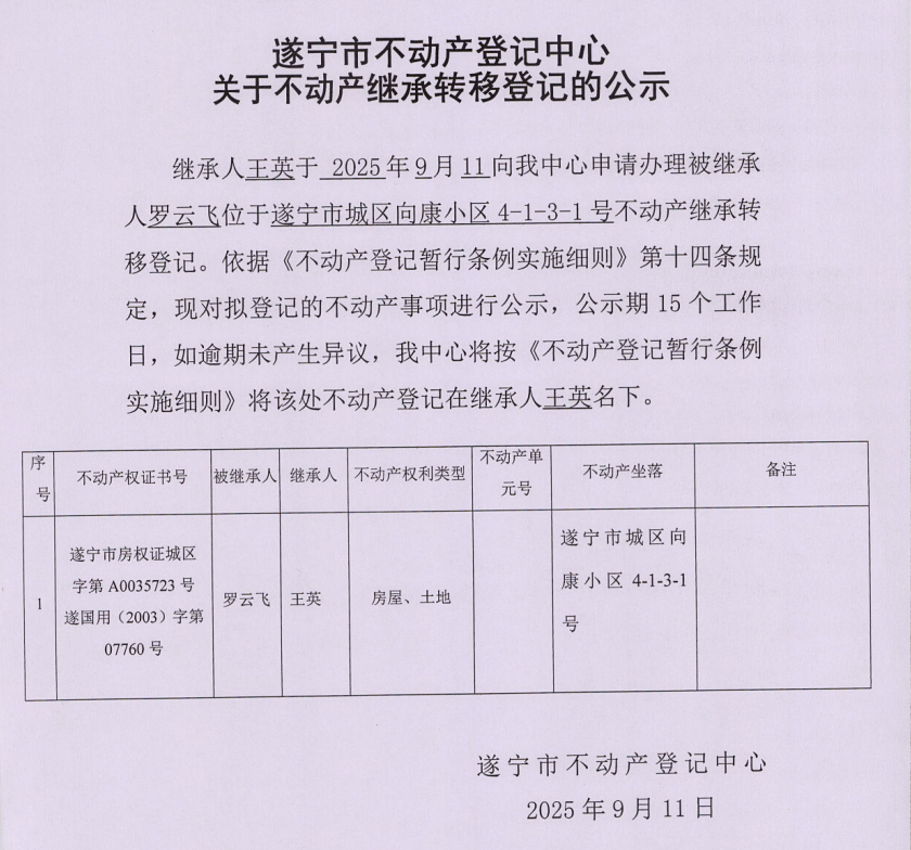 遂宁市不动产登记中心关于不动产继承转移登记的公示(王英)
