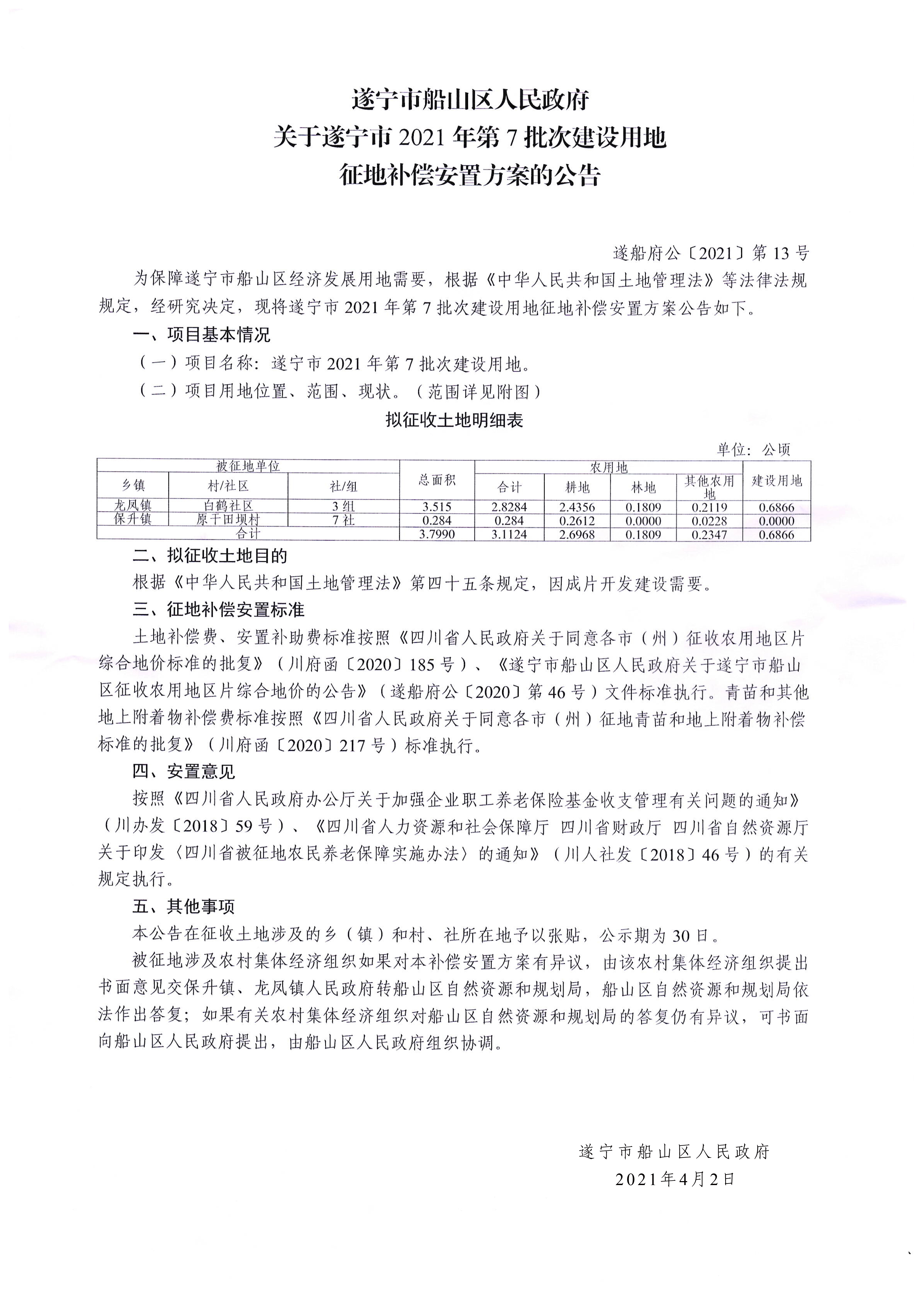 遂宁市船山区人民政府关于遂宁市2021年第7批次建设用地征地补偿安置方案的公告