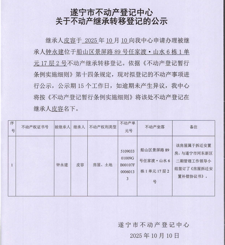 遂宁市不动产登记中心关于不动产继承转移登记的公示(皮容)