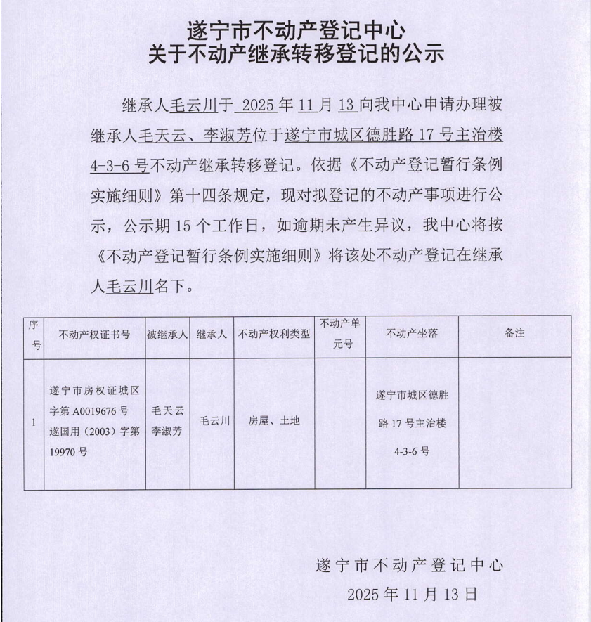 遂宁市不动产登记中心关于不动产继承转移登记的公示(毛云川)