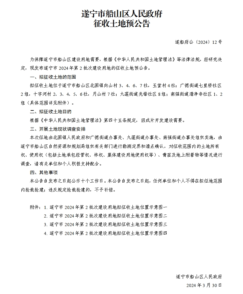 遂宁市船山区人民政府征收土地预公告 (遂船府公〔2024〕12号)