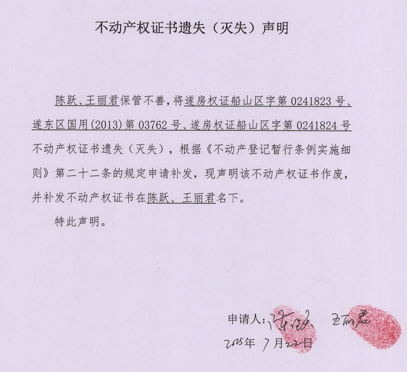 不动产权证书遗失(灭失)声明(陈跃、王丽君)