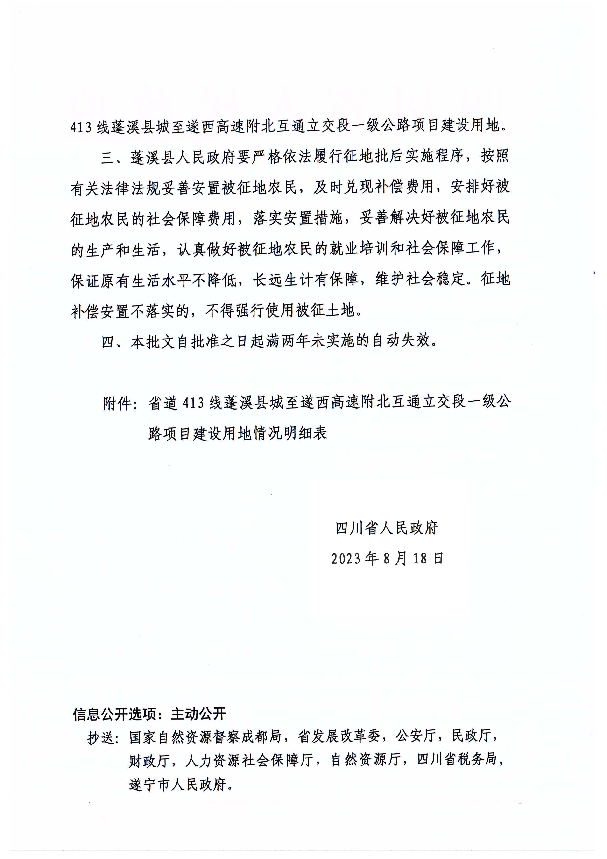 四川省人民政府关于省道413线蓬溪县城至遂西高速附北互通立交段一级公路项目建设用地的批复