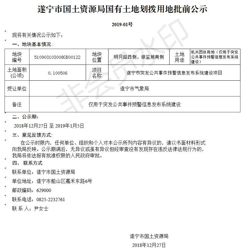 遂宁市国土资源局国有土地划拨用地批前公示(2019-01号)