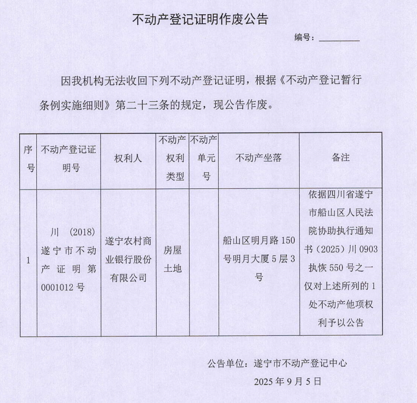 不动产登记证明作废公告(遂宁农村商业银行股份有限公司)