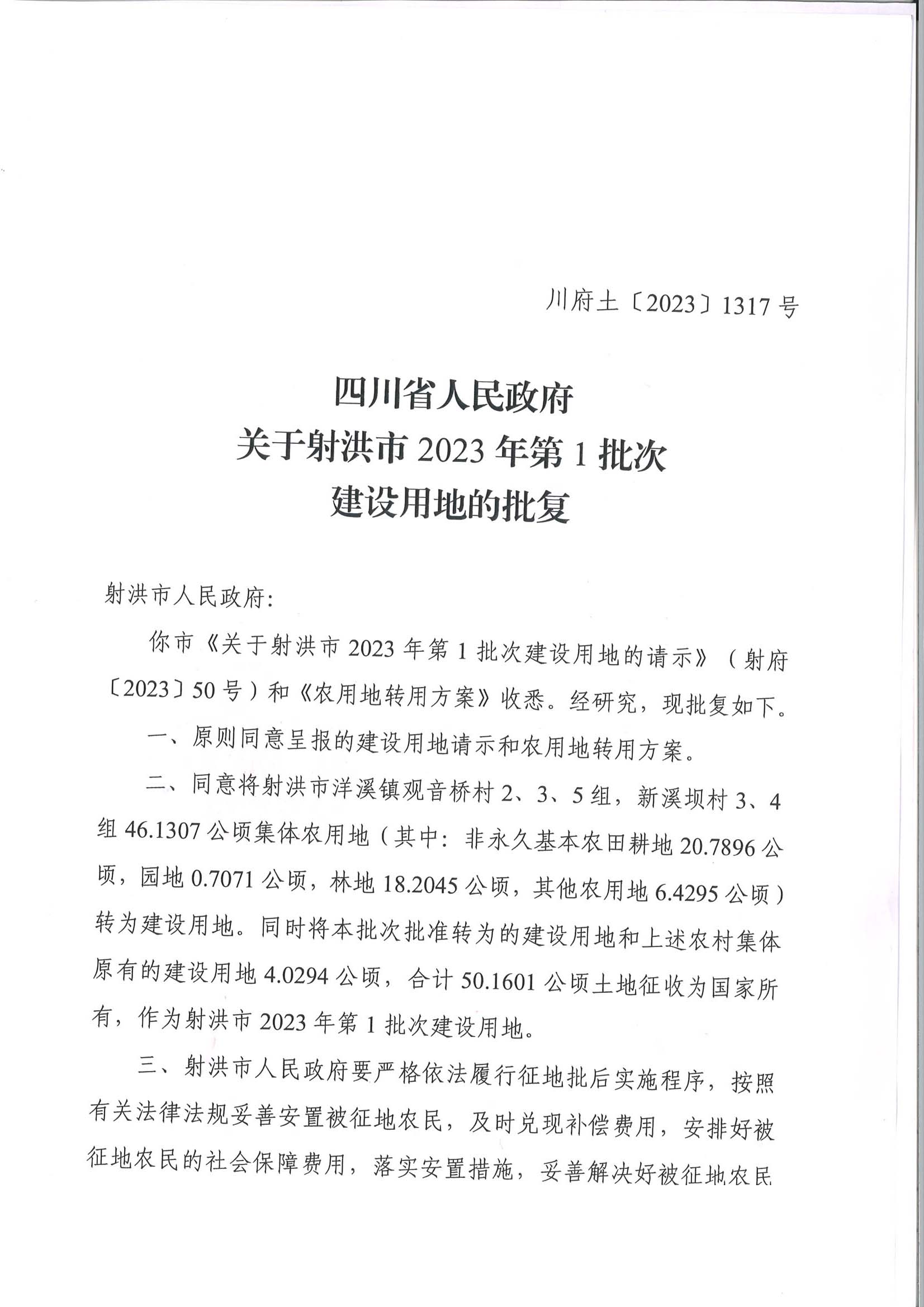 四川省人民政府关于射洪市2023年第1批次建设用地的批复(川府土〔2023〕1317号 )