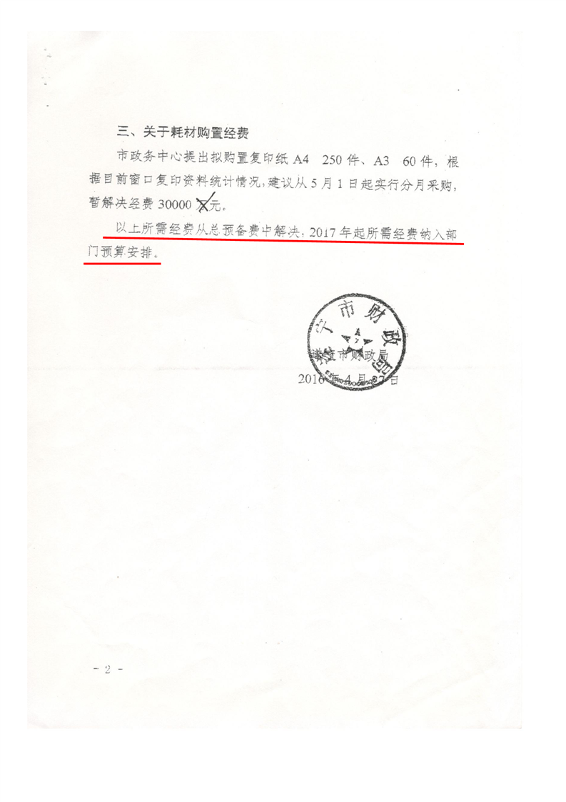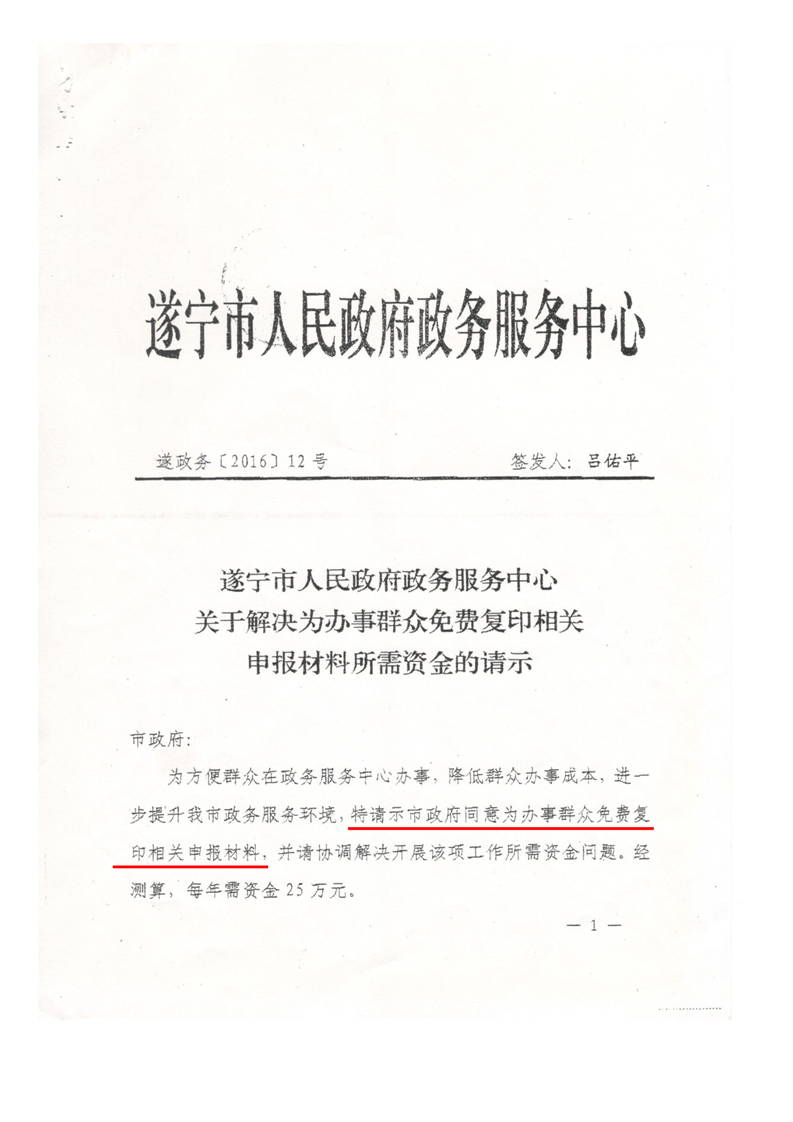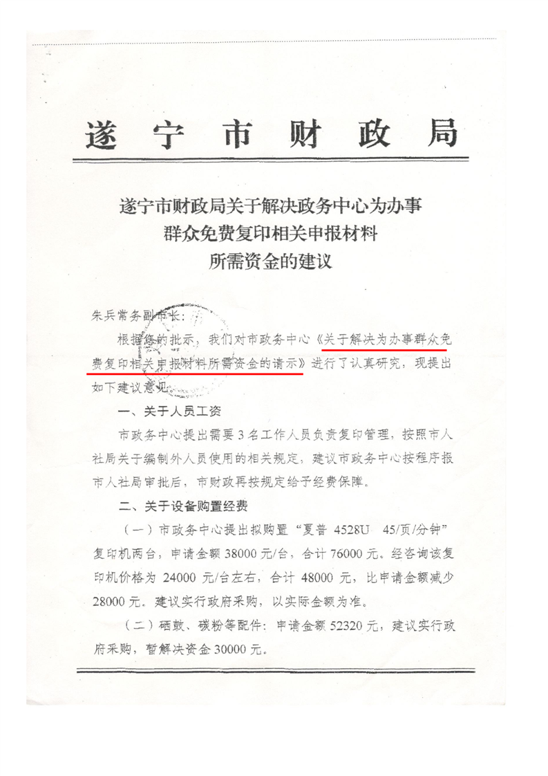 关于解决政务中心为办事群众免费复印相关申报材料所需资金的建议
