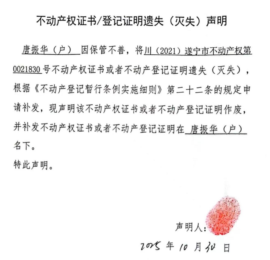 不动产权证书/登记证明遗失(灭失)声明(唐振华)