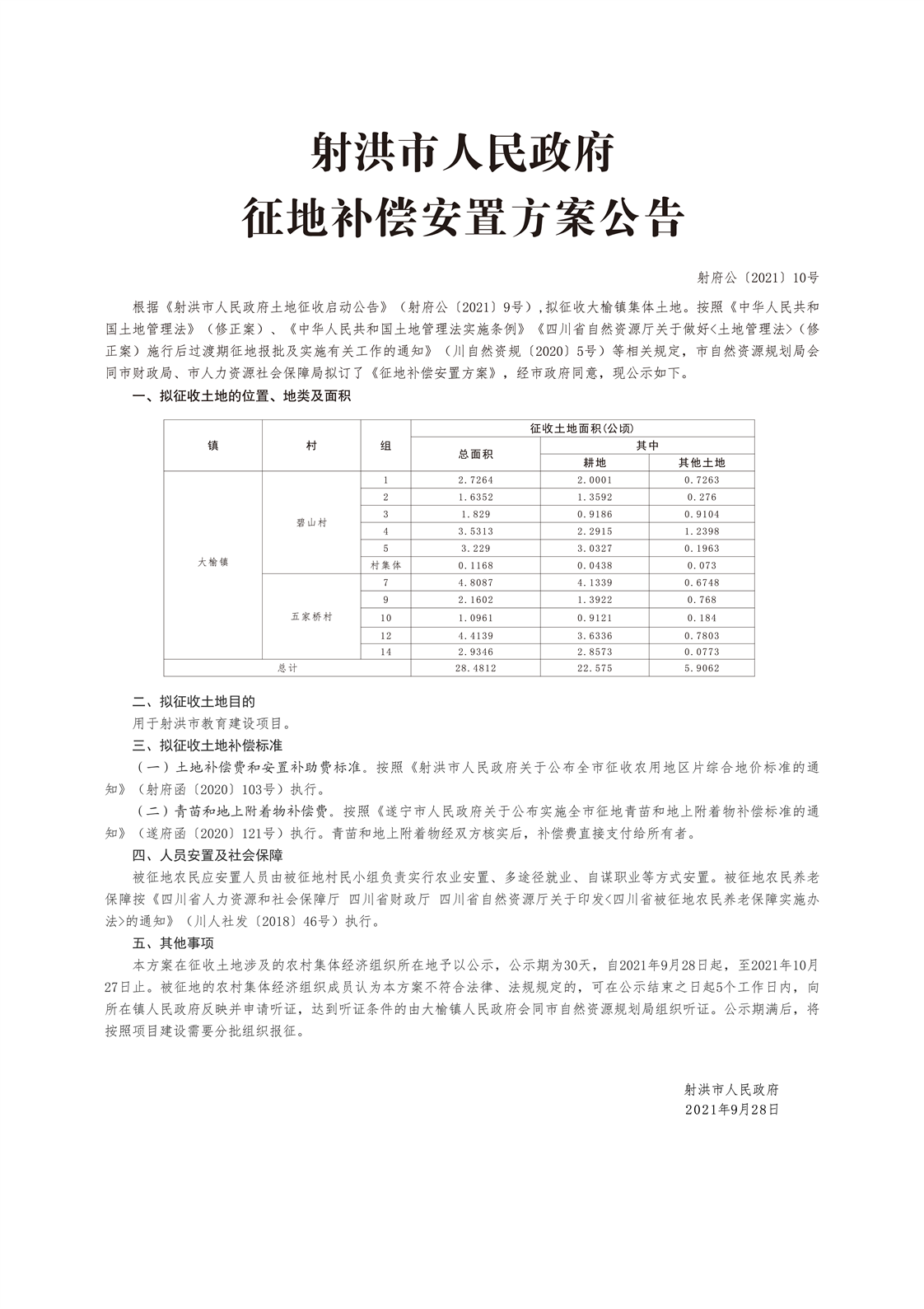 射洪市人民政府征地补偿安置方案公告(射府公〔2021〕10号)