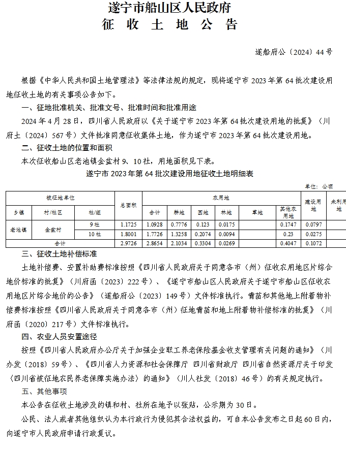 遂宁市船山区人民政府征收土地公告(遂船府公〔2024〕44号)