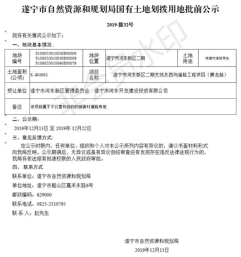 遂宁市自然资源和规划局国有土地划拨用地批前公示(2019-拨32号)