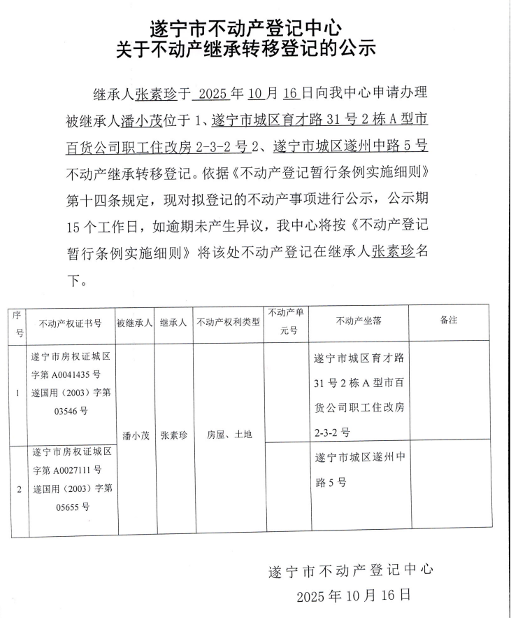 遂宁市不动产登记中心关于不动产继承转移登记的公示(张素珍)
