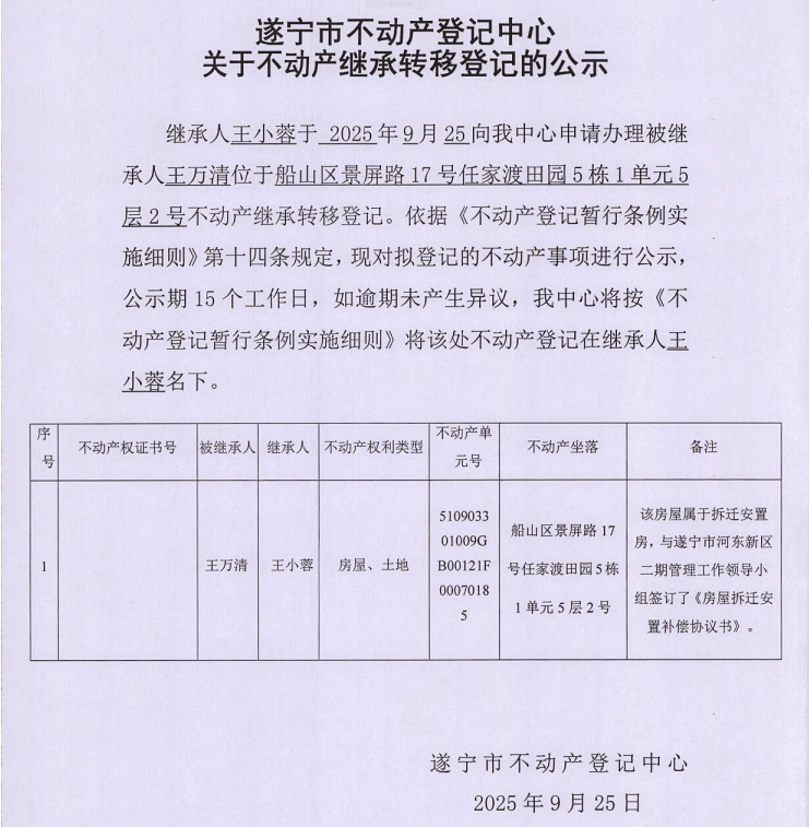 遂宁市不动产登记中心关于不动产继承转移登记的公示(王小蓉)