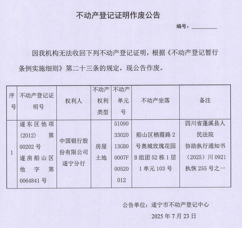 不动产登记证明作废公告(中国银行股份有限公司遂宁分行)