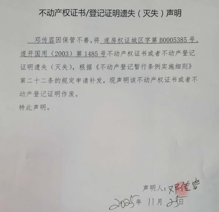 不动产权证书/登记证明遗失(灭失)声明(邓传容)