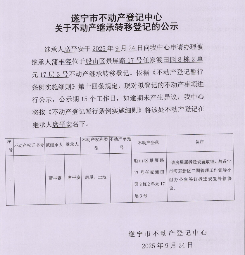 遂宁市不动产登记中心关于不动产继承转移登记的公示(席平安)