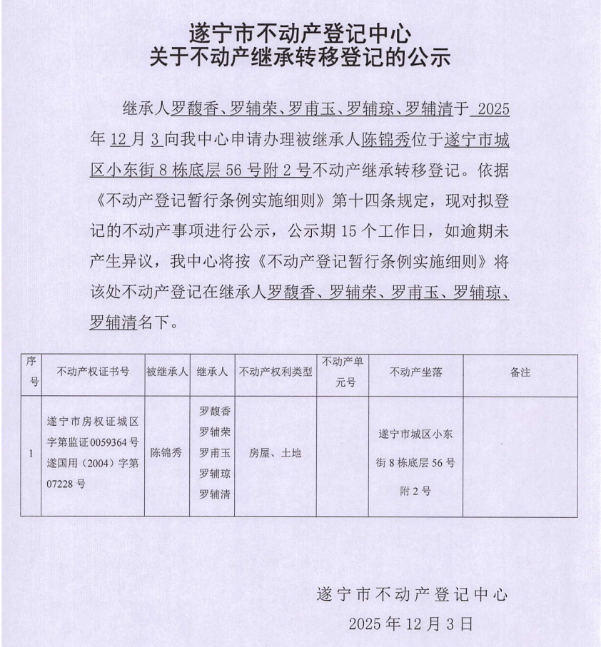 遂宁市不动产登记中心关于不动产继承转移登记的公示(罗馥香、罗辅荣、罗甫玉、罗辅琼、罗辅清)