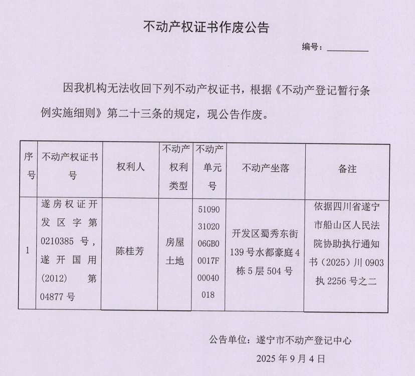 不动产权证书作废公告(陈桂芳)