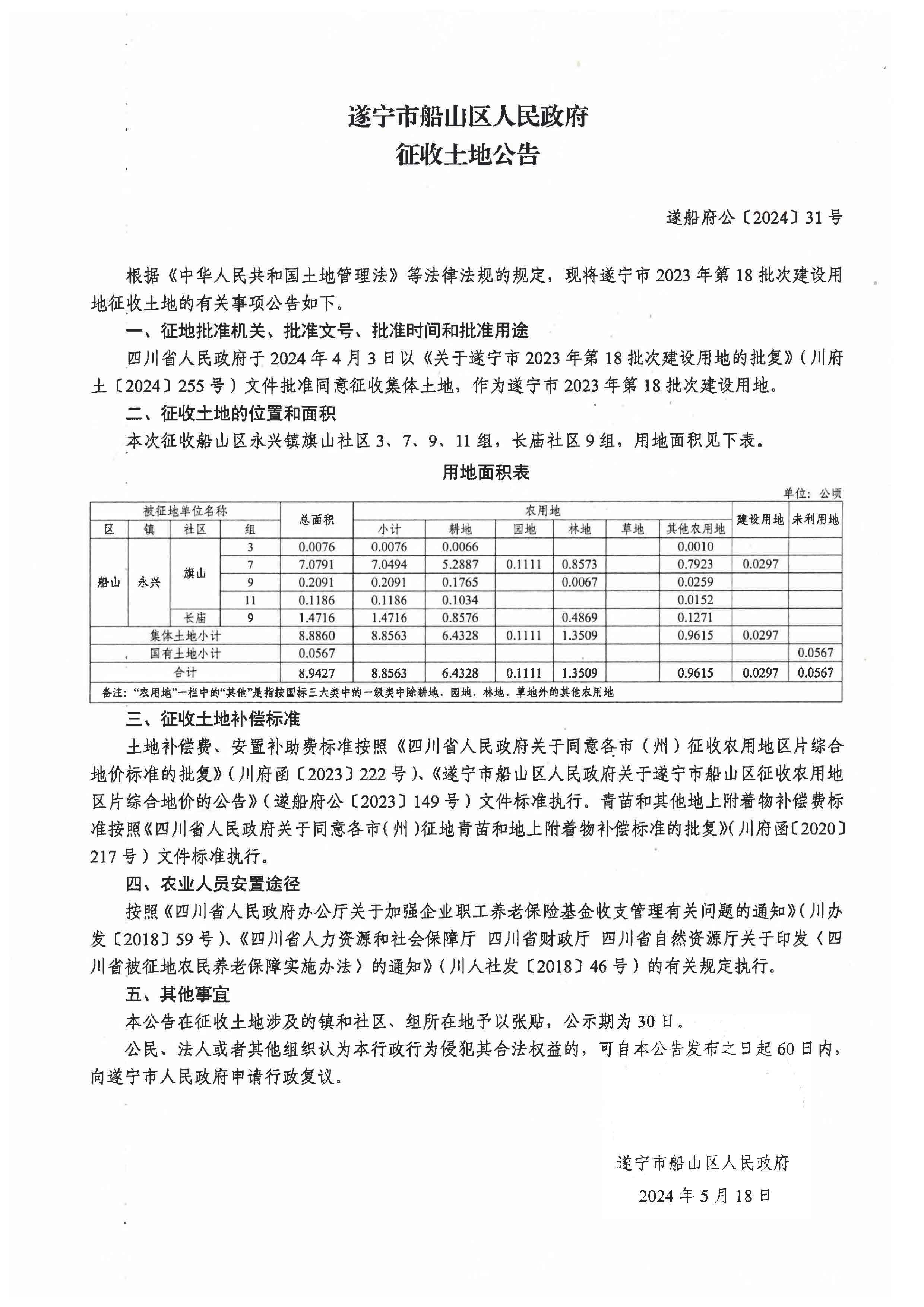 遂宁市船山区人民政府征收土地公告(遂船府公〔2024〕31号)