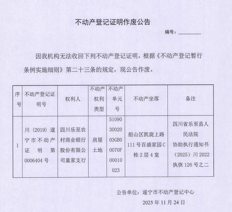 不动产登记证明作废公告(四川乐至农村商业银行股份有限公司童家支行)