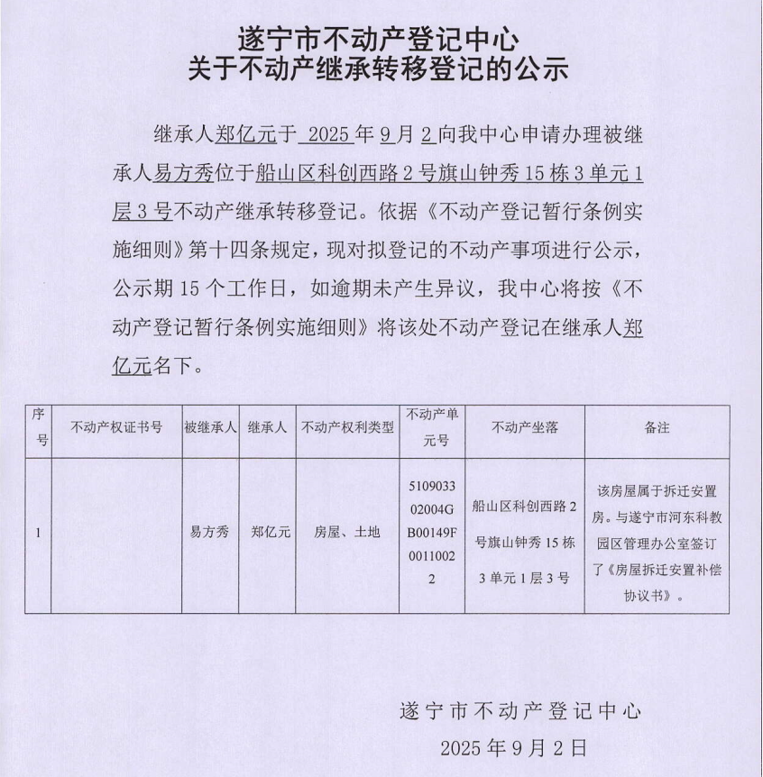 遂宁市不动产登记中心关于不动产继承转移登记的公示(郑亿元)