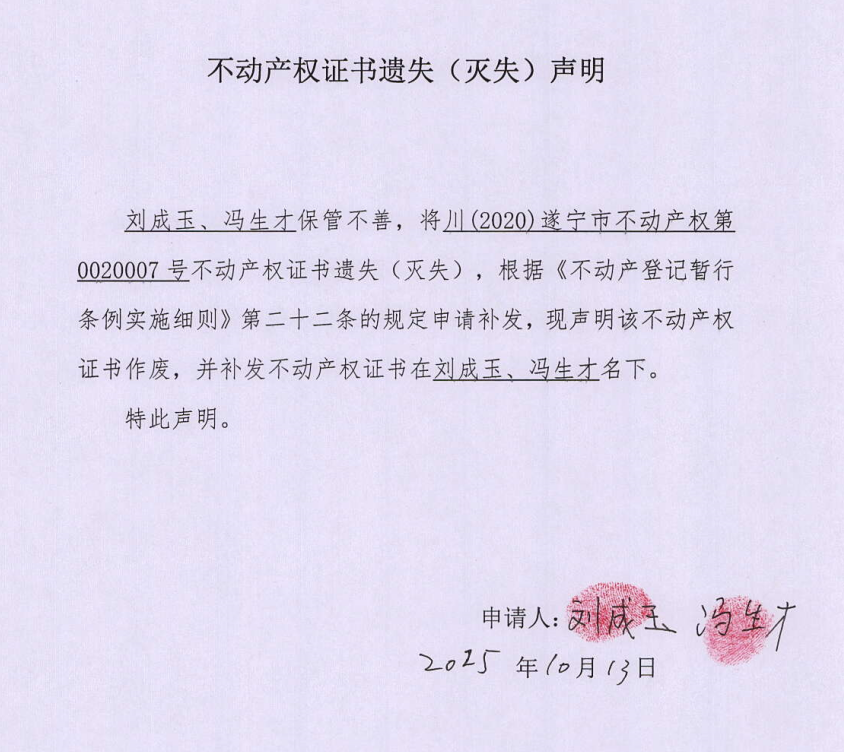 不动产权证书遗失(灭失)声明(刘成玉、冯生才)