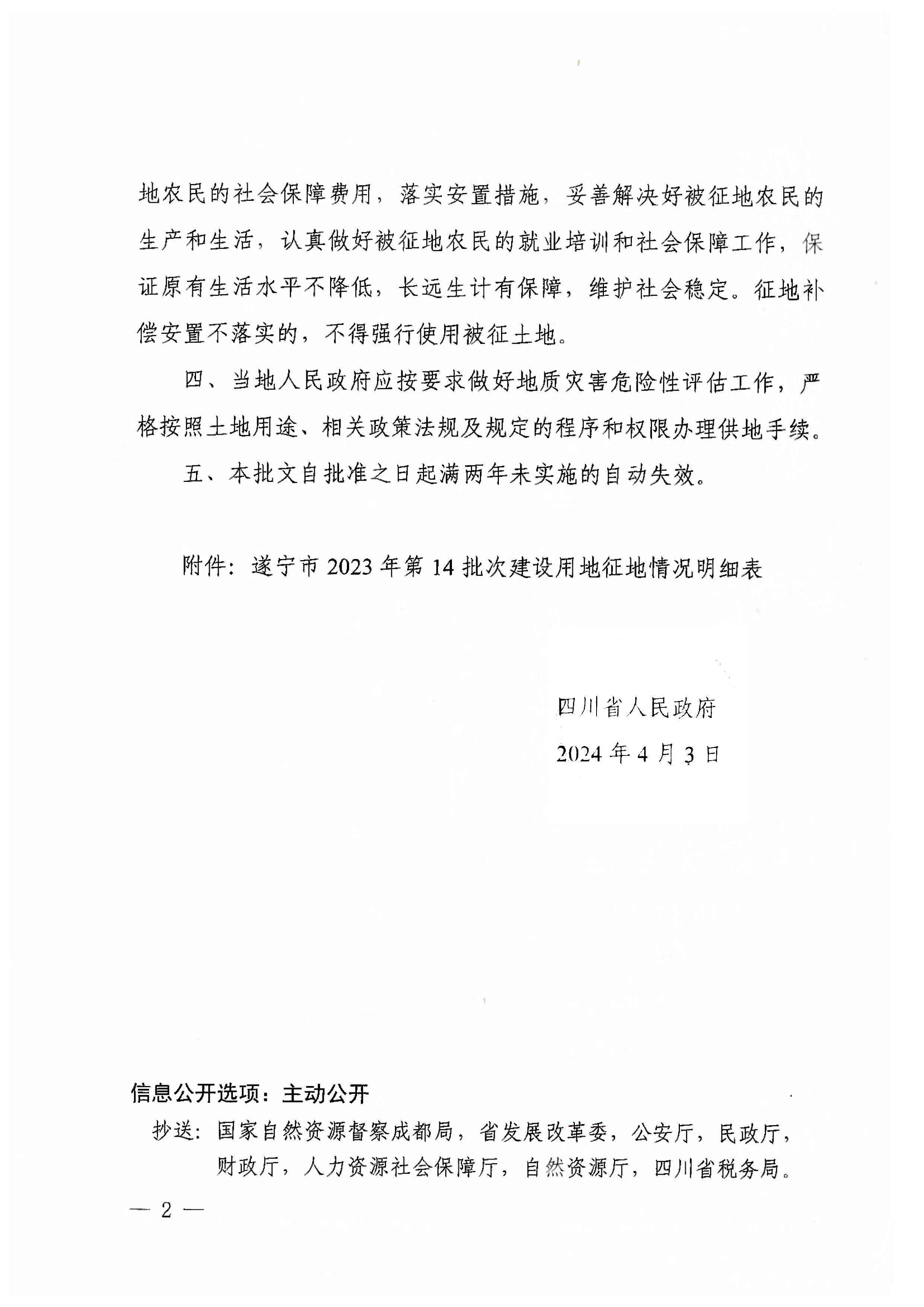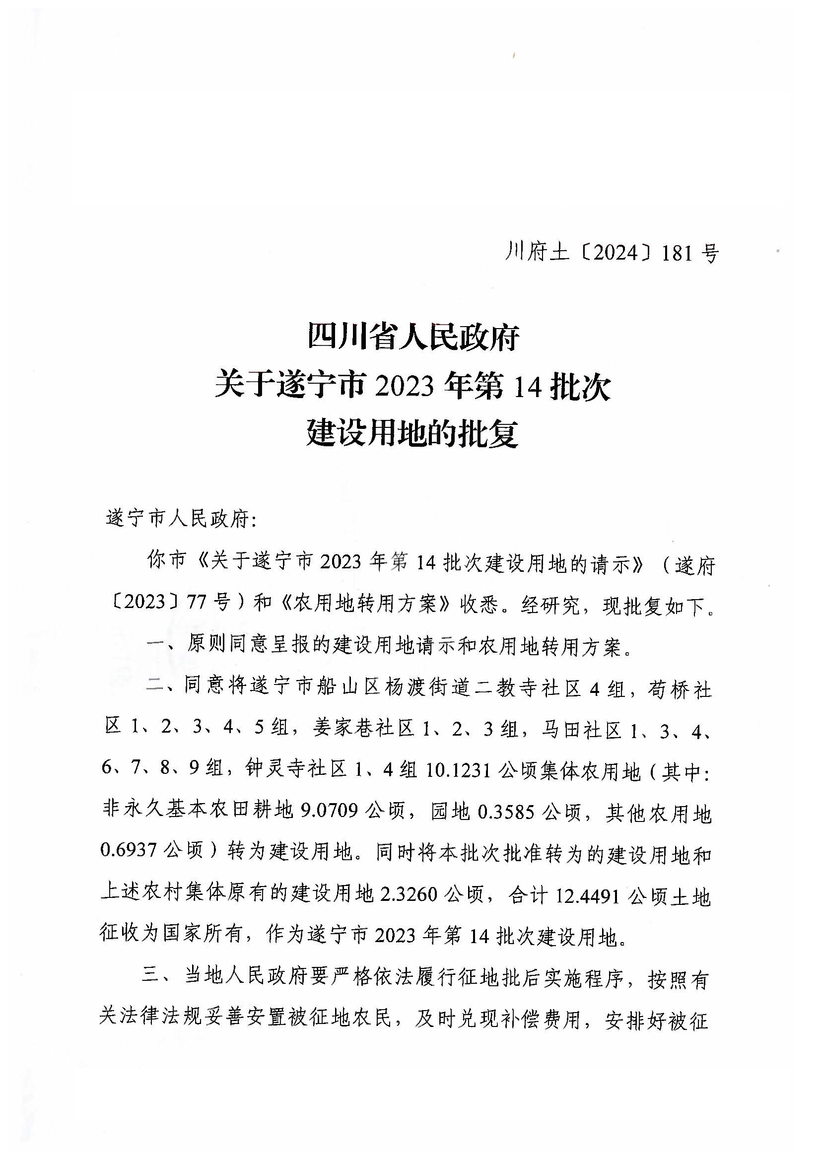 四川省人民政府关于遂宁市2023年第14批次建设用地的批复(川府土〔2024〕181号)