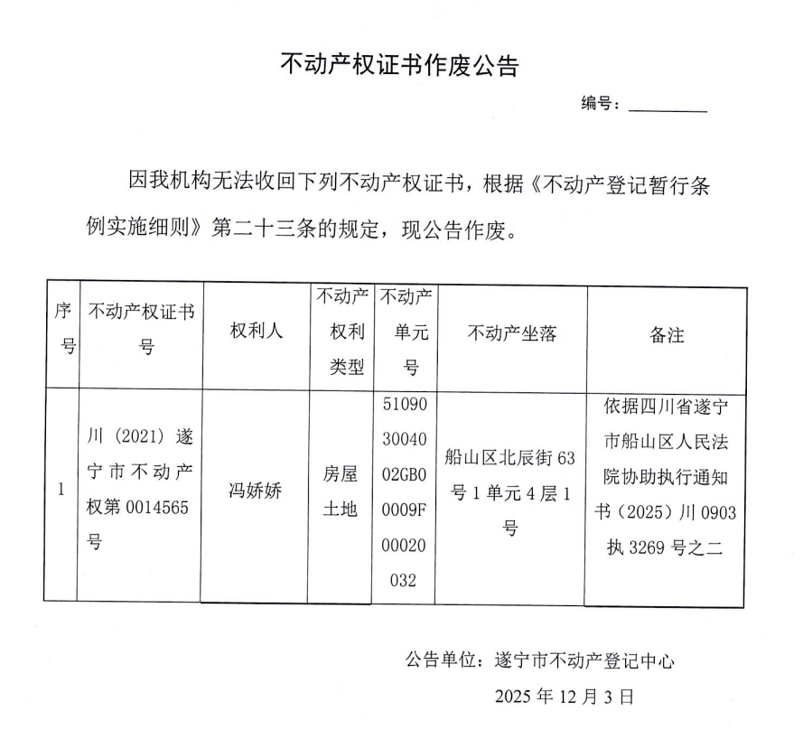 不动产权证书作废公告(冯娇娇)