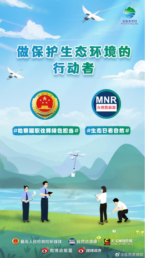 绿水青山就是金山银山。今年8月15日,是我国首个全国生态日。让我们一起亲近大自然,走进自然资源科普场馆,学习自然资源知识,领略自然魅力,尊重自然、顺应自然、保护自然。自然资源部联合最高人民检察院、微博政务、微博政能量共同发起话题,生态日看自然,检察履职诠释绿色担当,共做生态环境的保护者、建设者、受益者,共建人与自然和谐共生的现代化!做保护生态环境的行动者。