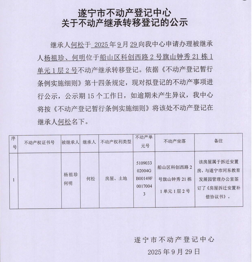 遂宁市不动产登记中心关于不动产继承转移登记的公示(何松)