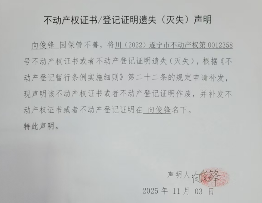 不动产权证书/登记证明遗失(灭失)声明(向俊锋)