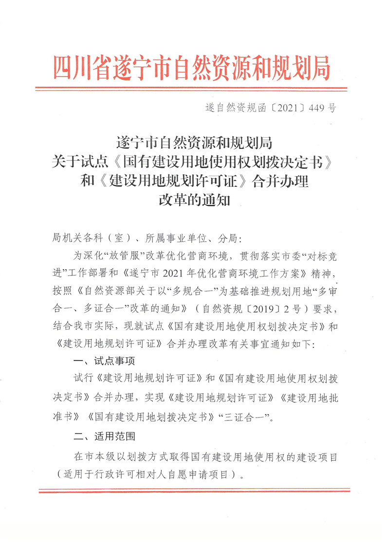 关于试点《国有建设用地使用权划拨决定书》和《建设用地规划许可证》合并办理改革的通知